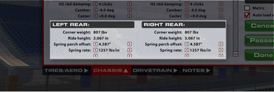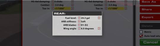 Questi valori possono anche essere modificati per osservare come il rake (l'inclinazione longitudinale della vettura) influenzi le prestazioni aerodinamiche, prima di apportare modifiche all'altezza da terra o alle molle.