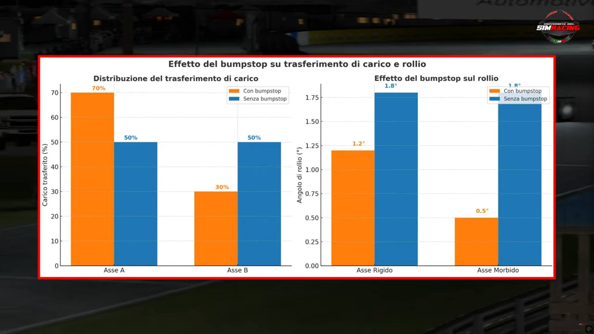 Al contrario, un assetto irrigidito, oppure una sospensione che arriva presto a lavorare sul bump stop, riduce il rollio, ma sposta una quota maggiore di trasferimento attraverso il canale geometrico della sospensione.