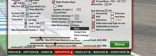 • Vai su Options > Graphics e modifica l'impostazione “Hide Obstructions” su "Cockpit Halo" o "All".