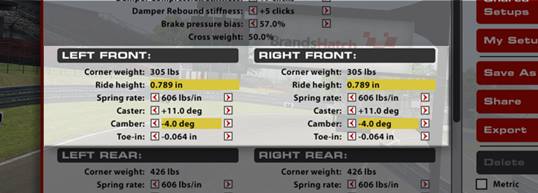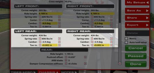 • Eccezione: Su piste asimmetriche (come Lime Rock Park), potrebbe essere vantaggioso utilizzare configurazioni asimmetriche del Toe posteriore e di altri parametri per ottimizzare la performance.