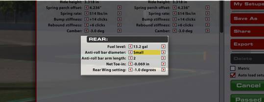 La regolazione del diametro della barra antirollio posteriore controlla la rigidità al rollio delle sospensioni posteriori.