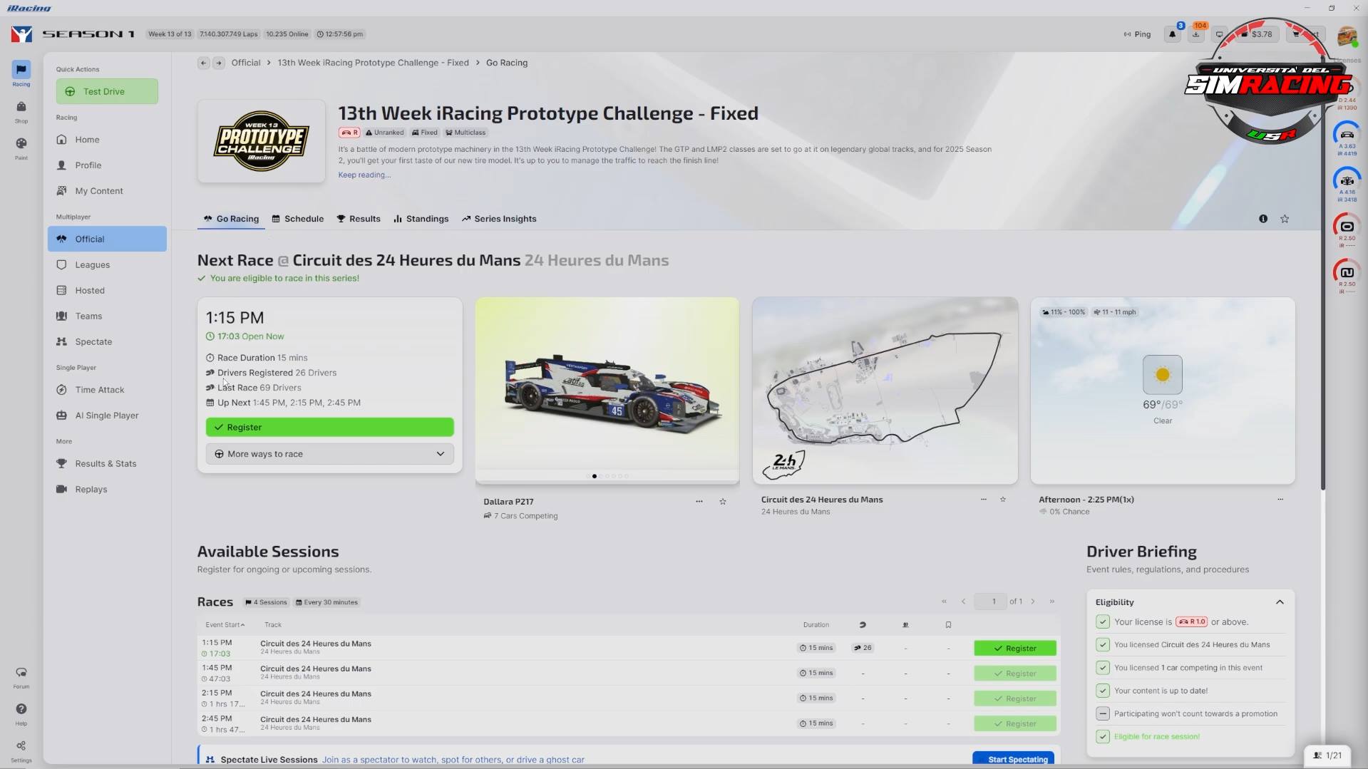 Sul lato destro dell’interfaccia, iRacing ha introdotto la sezione “Driver Briefing”, che racchiude vari menu a tendina con informazioni dettagliate sulla settimana in corso.