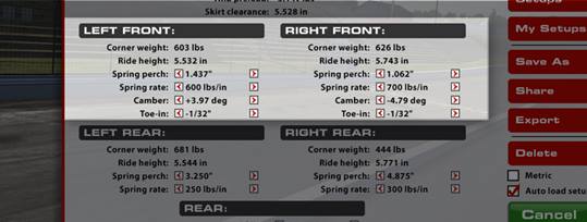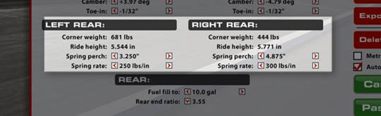 Questo valore può essere regolato attraverso gli offset delle molle agli angoli e, in misura minore, il precarico della barra antirollio (ARB).