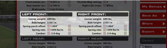 Le regolazioni dei parametri di compressione e rebound a bassa e alta velocità permettono di adattare la vettura alle caratteristiche del tracciato e alle preferenze del pilota.