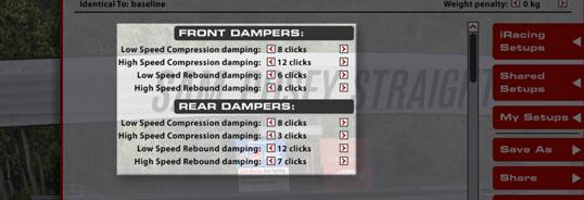 Regola la resistenza degli ammortizzatori alla compressione a basse velocità, tipicamente causata dai movimenti della carrozzeria dovuti a input del pilota (sterzo, frenata, accelerazione) e alle forze di curva.