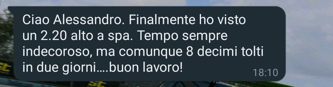 Il coach mi ha spiegato molto bene come si fanno le curve, come si accelera, come si frena, per esempio a Spa il mio best era di 2.20 e con questa coaching di un’ora son riuscito ad arrivare a 2.18 con ancora molto da migliorare.