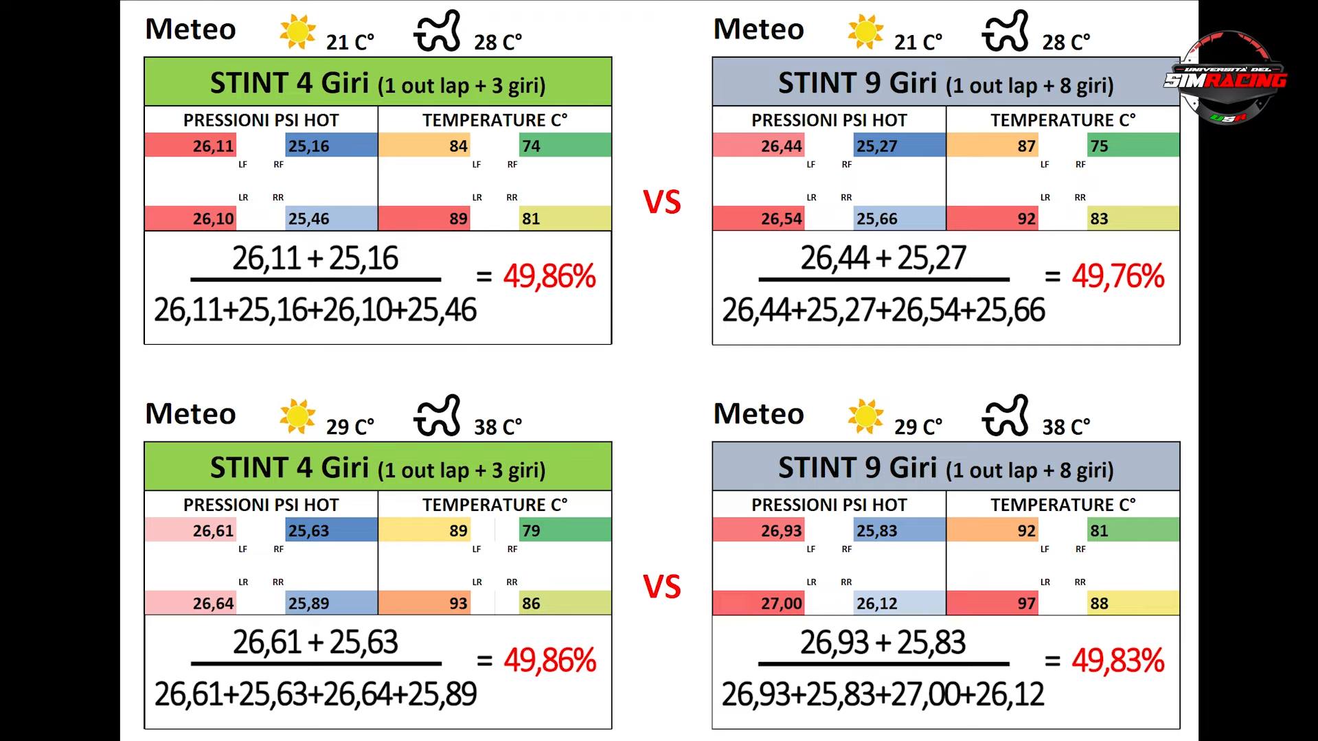 Impostiamo nuovamente temperature di aria e di asfalto a 21 e 28°C, quindi in un contesto ambientale decisamente più ideale, e gonfiamo gli pneumatici dell'asse di destra a 27 PSI (pressione a freddo, chiaramente) ed effettuiamo tre giri cronometrati.