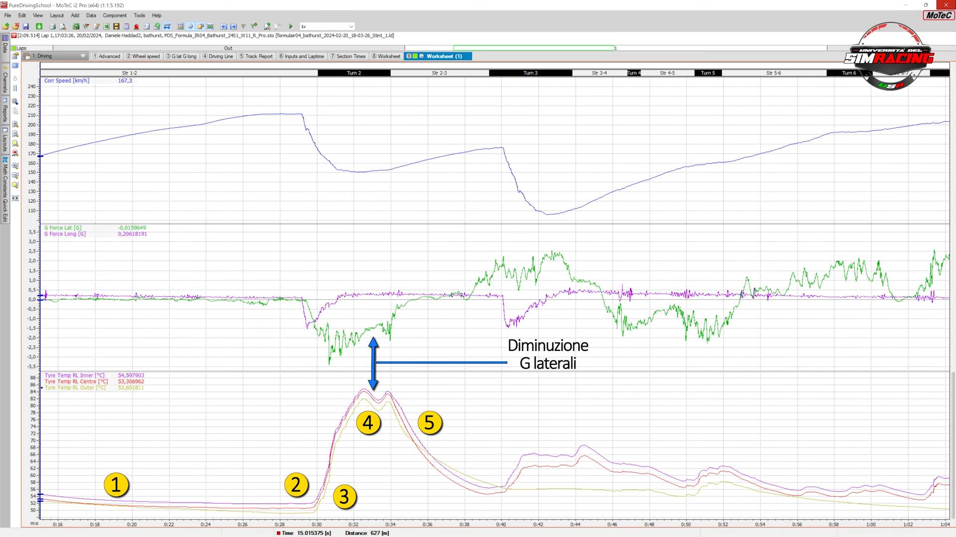 Da questo punto, possiamo osservare un rapido aumento della temperatura dello pneumatico, che raggiunge il proprio picco indicativamente nello stesso punto dell'accelerazione laterale, punto quattro.