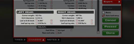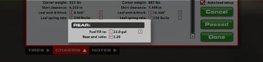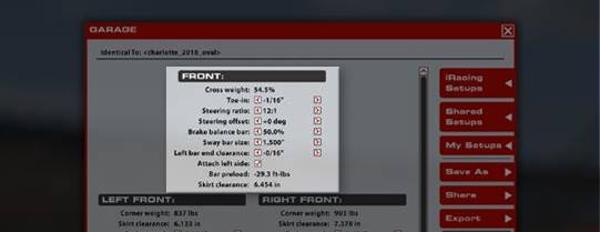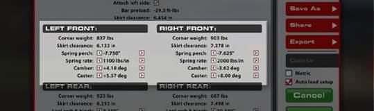 Questo valore si regola tramite le modifiche agli offset delle molle degli angoli e il precarico della barra antirollio anteriore (Front ARB preload).